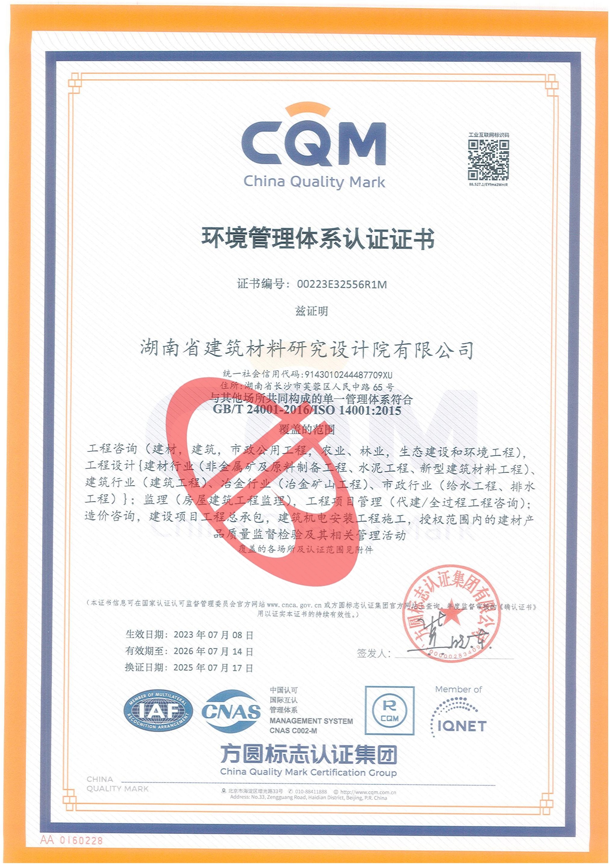 環(huán)境管理體系認(rèn)證證書(shū)